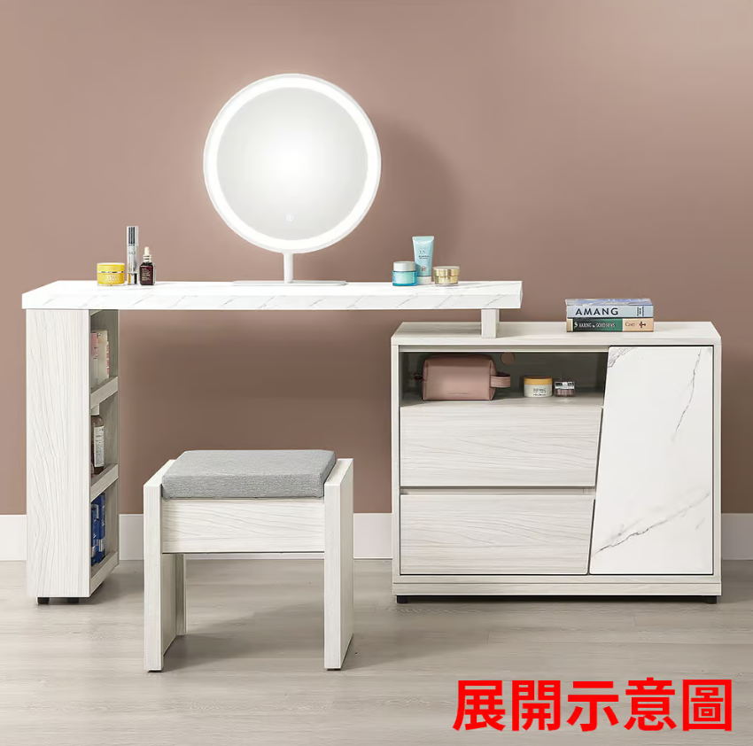 270-2 蘿拉4尺多功能組合鏡台 全組含椅 (不分左右方向) (收納櫃門內附1片活動隔板)(仿大理石紋美耐皿桌面)