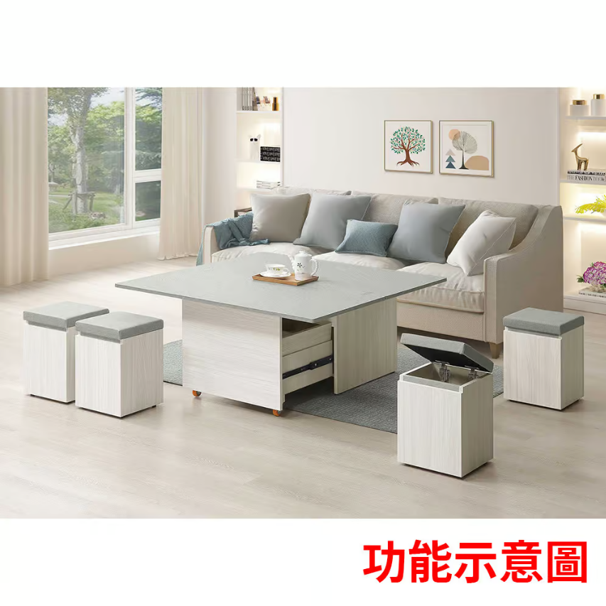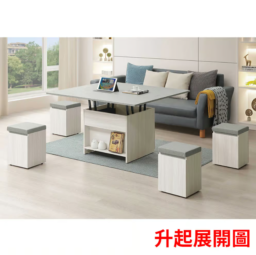 534-2 黛拉4尺雙升降大茶几 (附4張可置物輔助椅) (輔助椅尺寸:寬29.5x深29.5x高42cm) (油壓升降五金.附2顆活動車輪)