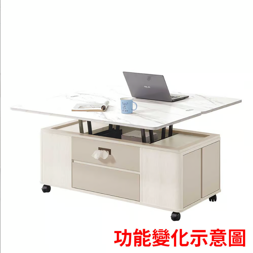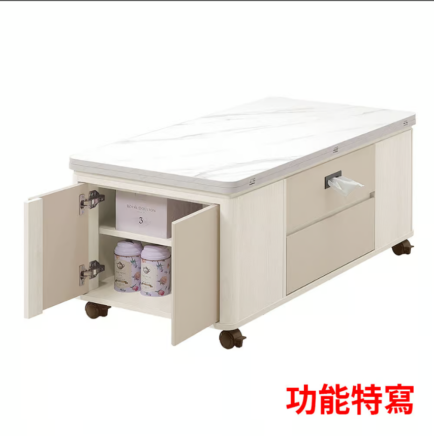 536-2 蕾佳娜4尺升降茶几 (面板為仿大理石紋美耐皿耐磨塗裝) (油壓緩衝升降五金.附6顆可固定輪) (兩面單抽皆可開.左右門內各附1片活動隔板)