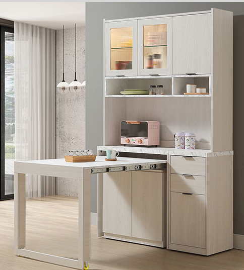 817-2蘿拉4尺伸縮功能桌餐櫃(上+下)⊙上座附1片玻璃隔板.1片木心板隔板、 ⊙2.65尺下座附1片固定隔板、 ⊙1.3尺下座無隔板、 ⊙附USB充電式LED感應燈、附一個電線孔 附*2輔助椅