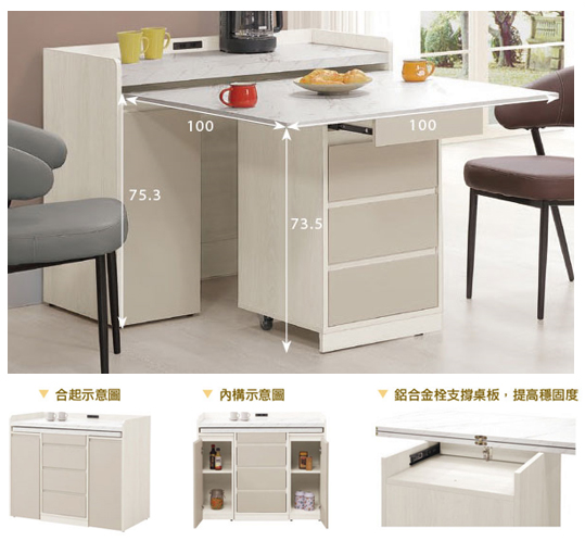 839-6 優悅4.2尺伸縮中島岩板餐桌櫃 ⊙附1片活動隔板.附USB-TYPE-C插座、 ⊙兩面單抽.單門皆可開、
