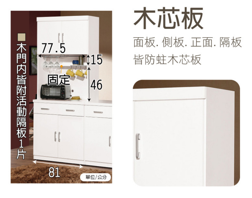 ◆面板、側板、正面、隔板皆防蛀木心板