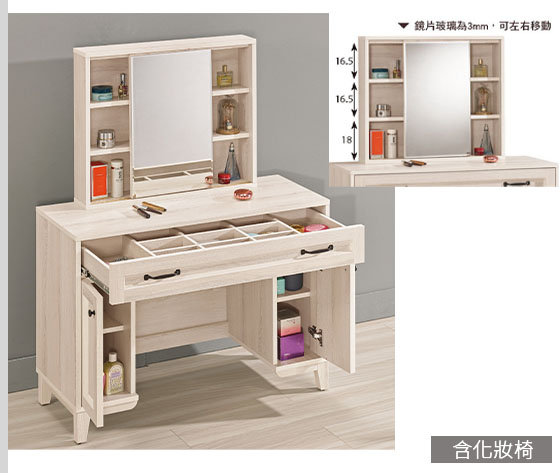 化妝椅坐墊可掀開置物,收納空間更多。