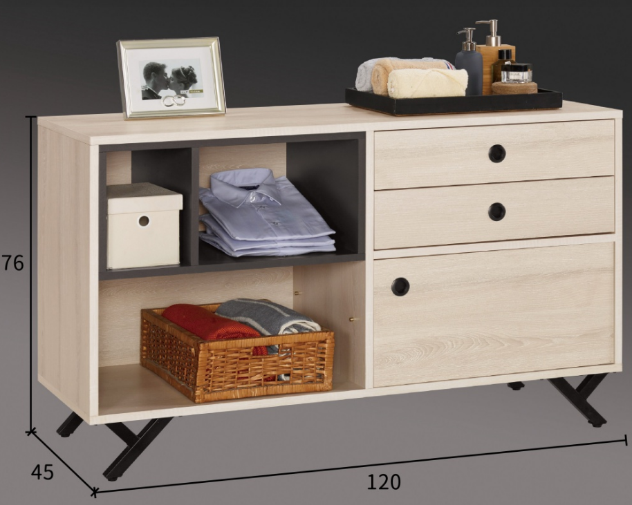置物斗櫃有2個抽屜1門、及2大格開放置物空間,分類收納超好用。