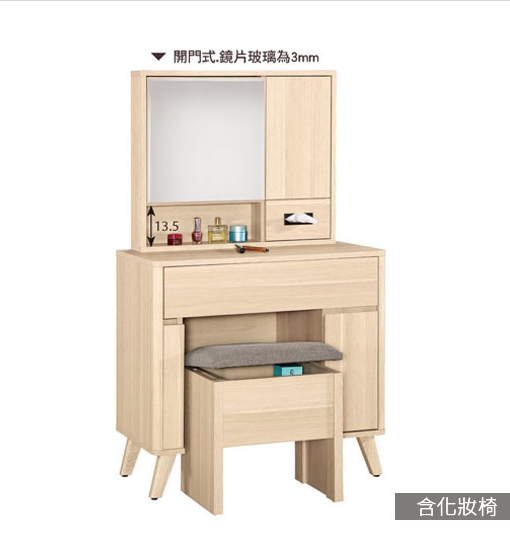 開門式鏡片設計,內有置物空間,化妝椅也能掀開置物,分類收納超多收納空間。