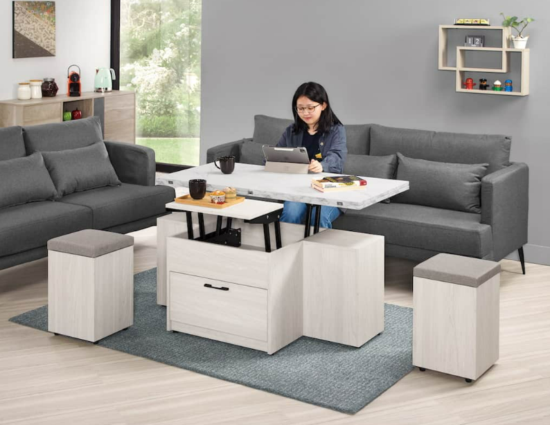 桌面升降餐桌設計,可將桌面升高為餐桌高度,用電腦、吃東西,實用度100%。