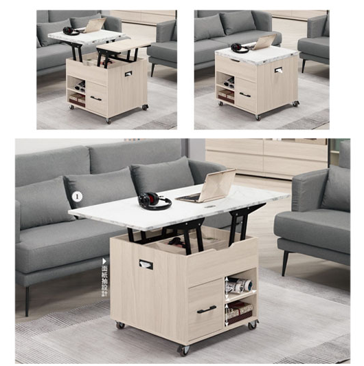 桌面升降餐桌設計,可將桌面升高為餐桌高度,用電腦、吃東西,實用度100%。