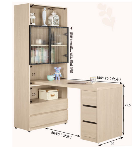 5尺L型三抽書桌:寬151 深80 高197 cm (附活動隔板1片)