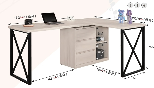 5.8×4尺書桌(桌面4尺+4尺):寬176 深120 高76 cm