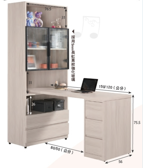 5尺L型三抽書桌:寬151 深80 高197 cm (附活動隔板1片)