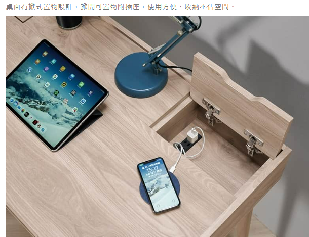 桌面有掀式置物設計,掀開可置物附插座,使用方便、收納不佔空間。