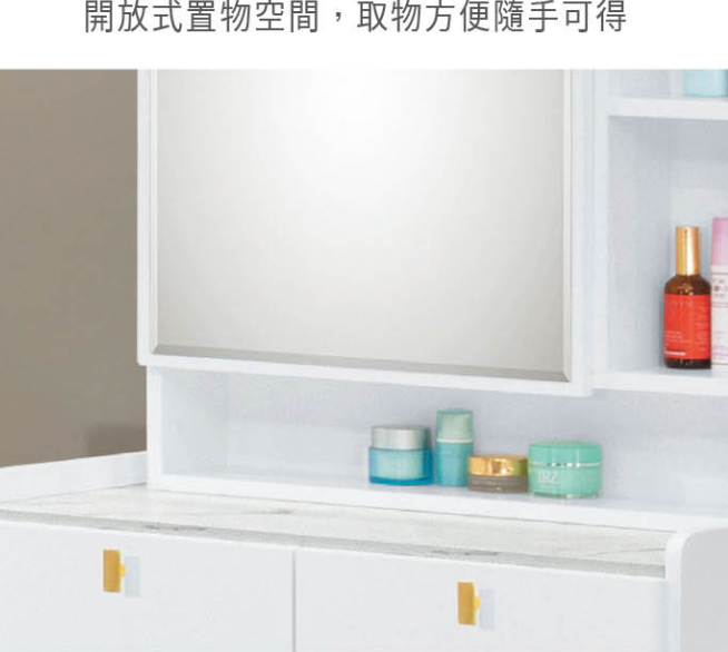化妝鏡為開門式設計,化妝椅也能掀開置物,分類收納超多置物空間。