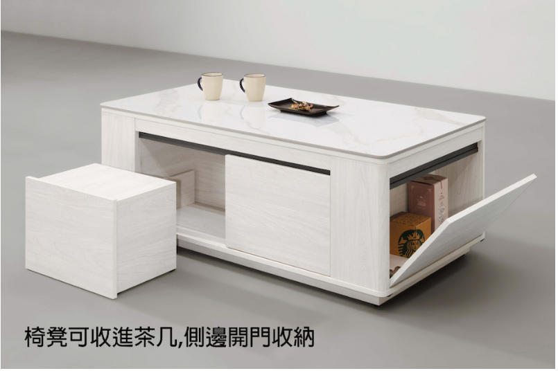 2個椅凳可收進茶几內,側邊開門收納,多功能超實用收納。