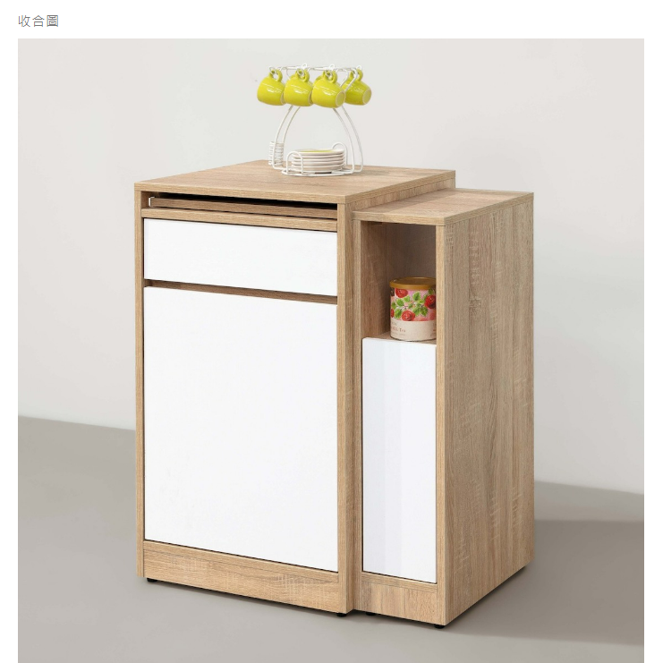 側桌和餐櫃可收合,不佔空間,側桌可拉合延伸桌面,可左右自由擺放,彈性使用多功能。