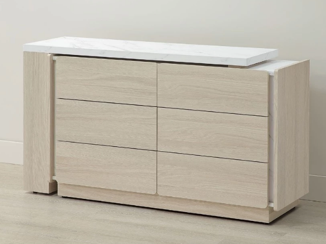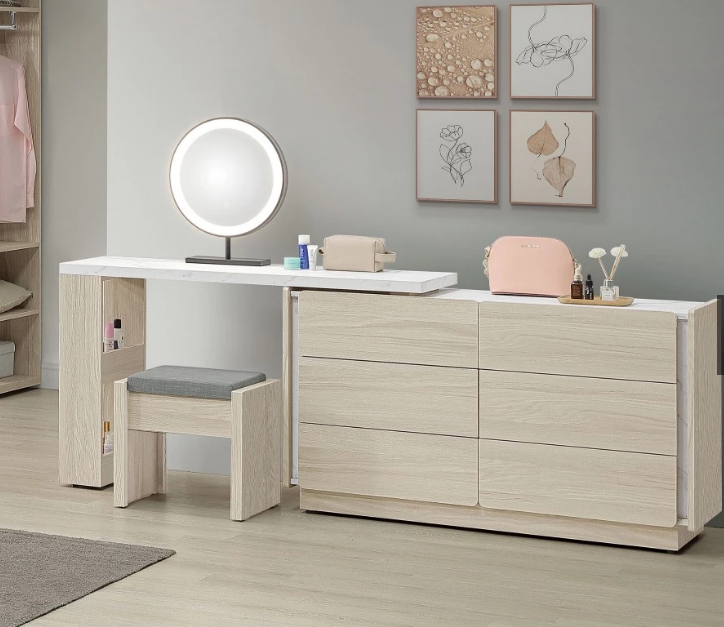 正面、側板與抽牆採用台灣製造A級環保木心板,專利技術同調木紋鋼刷壓紋,猶如實木質感、