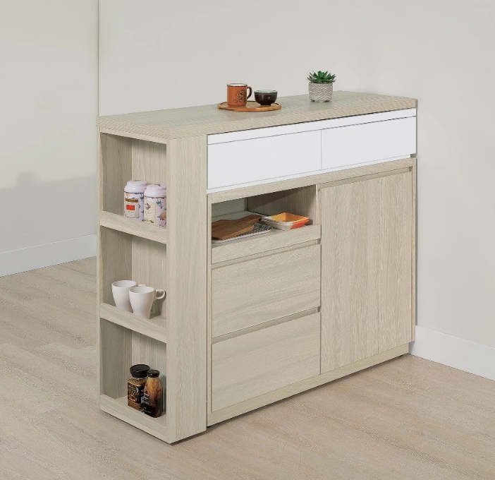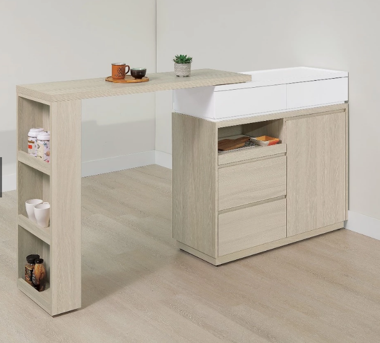4尺伸縮餐餐櫃桌組:櫃寬105*深40*高95cm;L桌寬120*深40*高104cm(門內一隔板;拉盤功能抽牆;可一直線使用;L桌可自由收合)