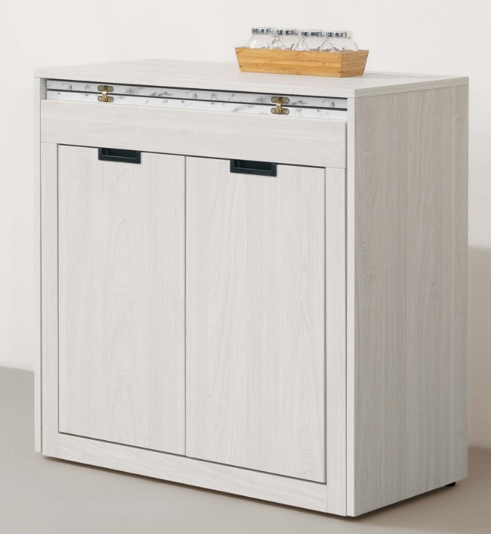 變形金鋼系列,伸縮桌面平時可收進餐櫃中,底下有輪子好推好移動,小空間最實用的貼心組合。