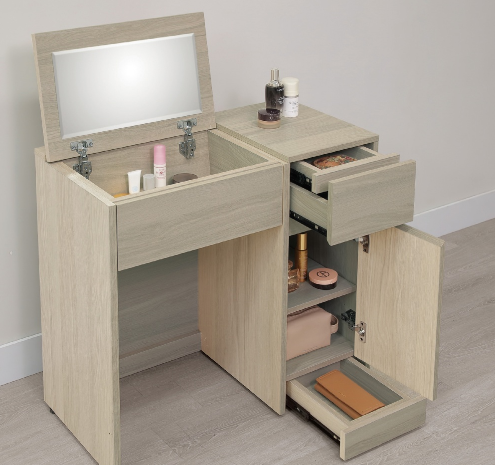 正面、檯面、側板、抽牆採用台灣製A級環保木心板,專利技術同調木紋鋼刷壓紋,猶如實木觸感