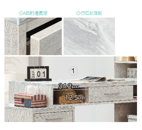 桌面採美耐皿仿大理石紋面板、釘附式美背、